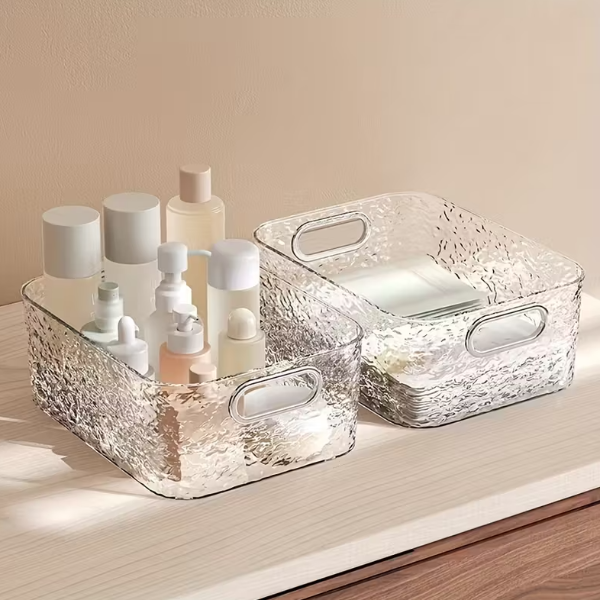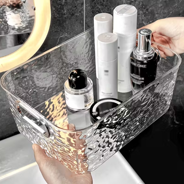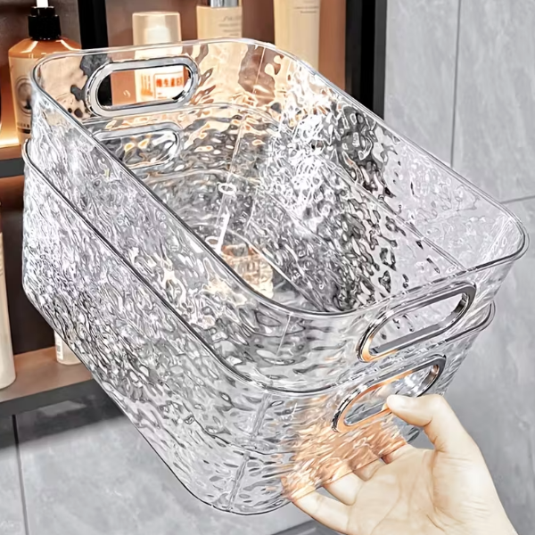 Su material resistente y transparente permite ver fácilmente el contenido, mientras que su formato amplio y sus asas integradas facilitan el traslado y el acceso a los productos.