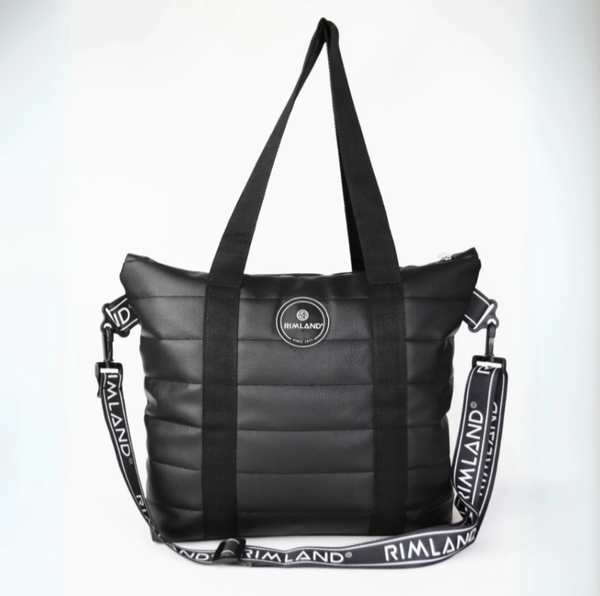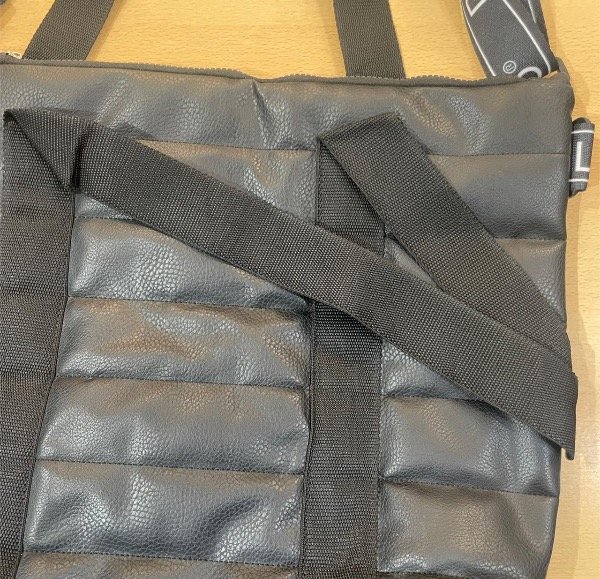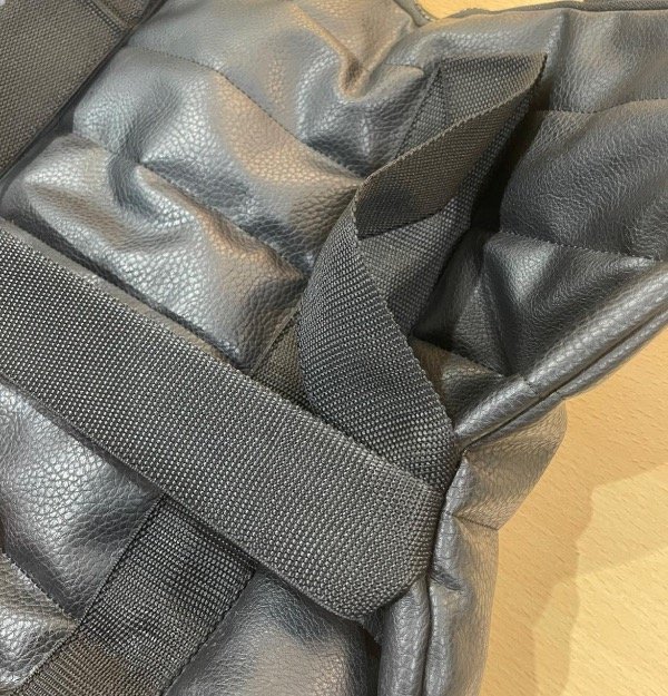 . una de las manijas negras está cocida sobre la costura del lateral.