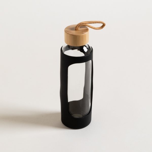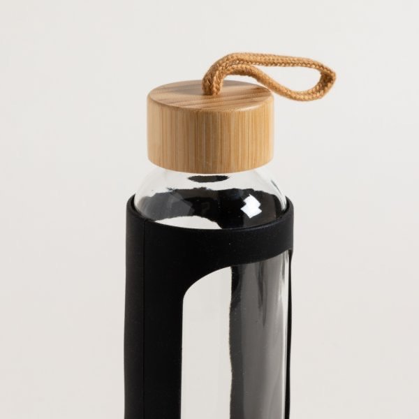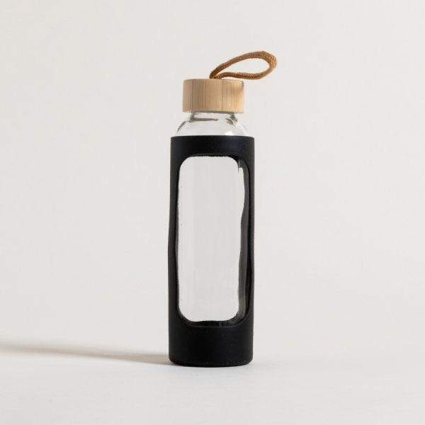Botella de vidrio con funda de silicona negra y tapa de bamboo.