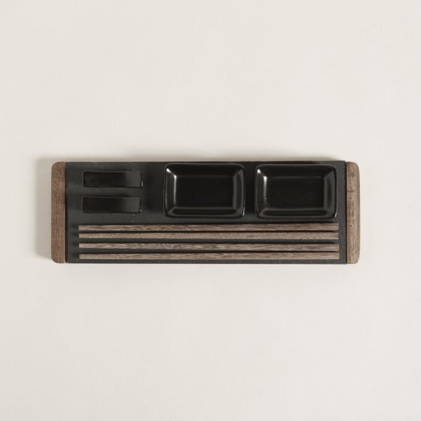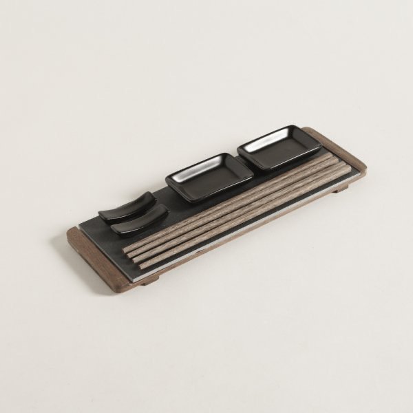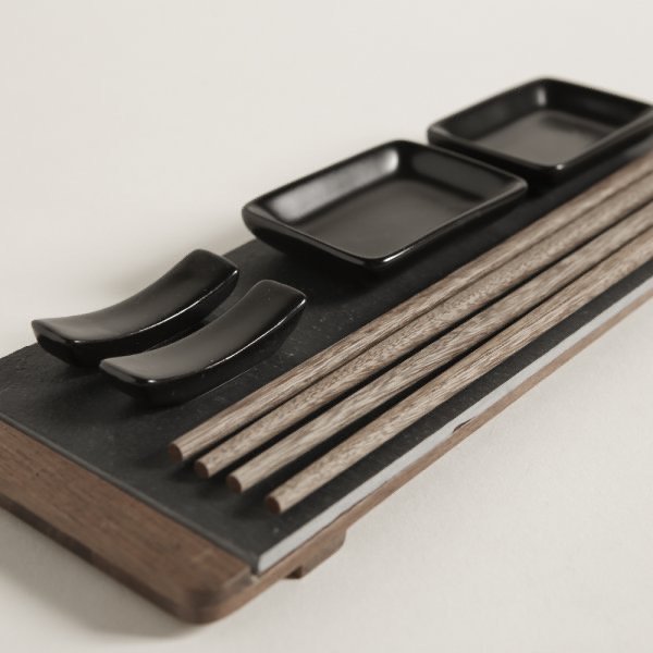 Set de sushi para 2 comensales, de acacia, laja y porcelana negra satinada.