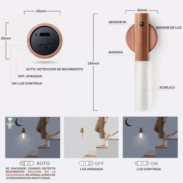 - Tres modos inteligentes: luz continua, apagado, sensor de movimiento