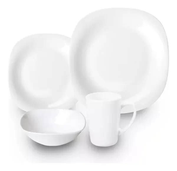 Incluye: 16 piezas: 4 platos playos 28,5 x 26,2 cm + 4 platos de postre 21 x 19,8 cm + 4 bowls soperos / cerealeros 16,2 x 14,6 + 4 jarros mug 350 ml con caja color.