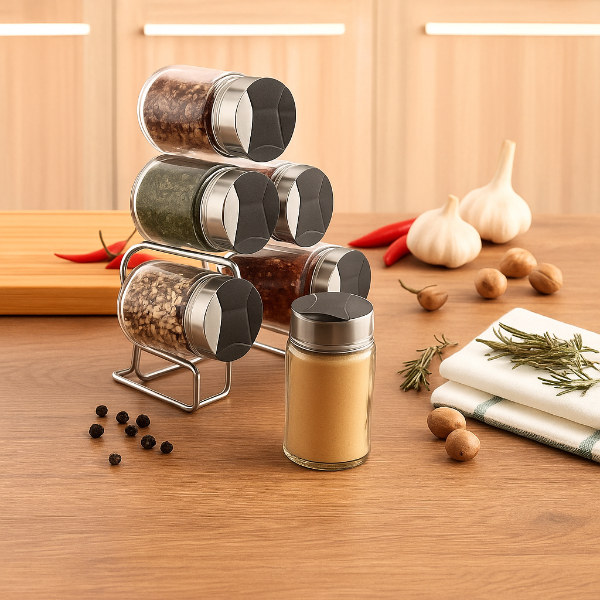 Set especiero exhibidor x6 - rack triangular cromado en forma de pirámide